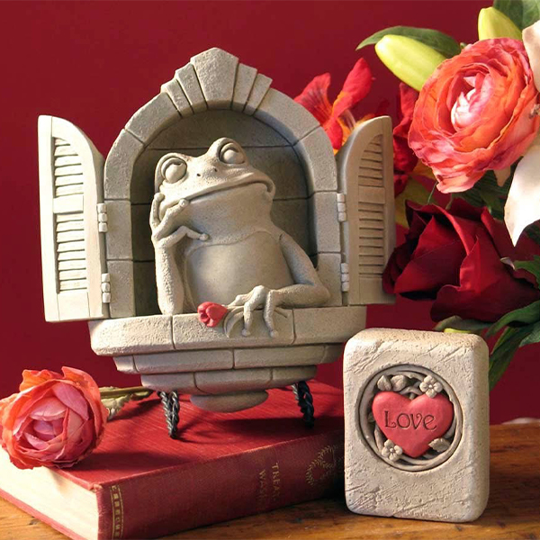 何やら考えごと中の彼。小さなお城みたいなバルコニーからひょっこり。手にしたお花は…もしかして恋の予感?答えは彼だけが知っているのです。お庭の壁に、池や噴水のそばに…どこにいても物語を添えてくれる愛らしい存在。大切な人へのギフトにもぴったりです。