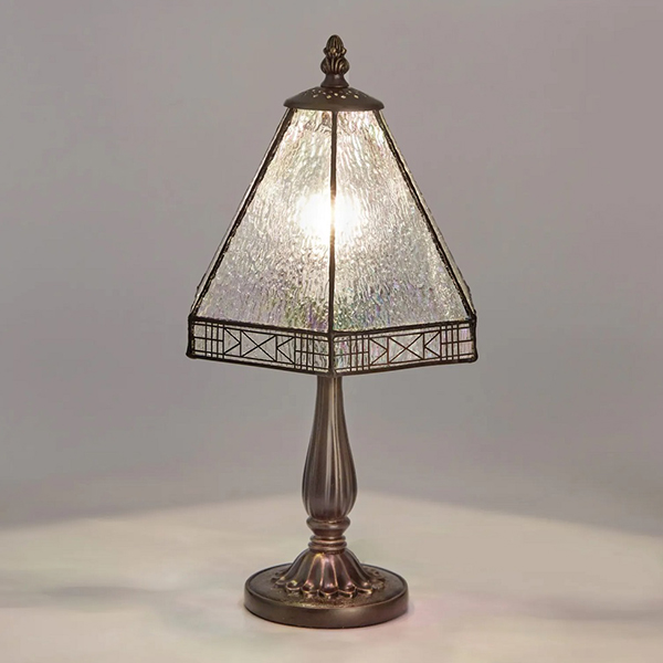 傘の底部の意匠が繊細な印象を与えるステンドグラスランプです。